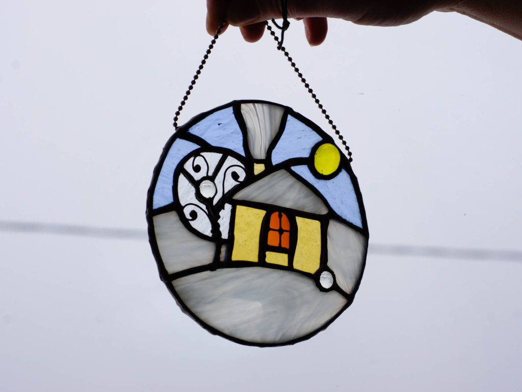 Осваивать работу со стеклом мастер начинала с витражей и небольших подвесок. Даже этим сейчас нельзя заниматься в доме, ведь когда режешь и обтачиваешь стекло, вокруг собирается мелкая стеклянная крошка.