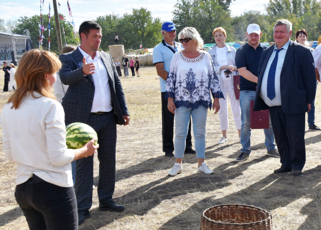 Вместе с приехавшими на праздник главами девяти районов Сергей Балыкин осматривает подворья. Оренбургскому району есть, чем удивить. Чтобы попасть в наше подворье, сначала нужно сыграть в арбузный боулинг. Такое необычное развлечение придумали представители посёлка Экспериментального.