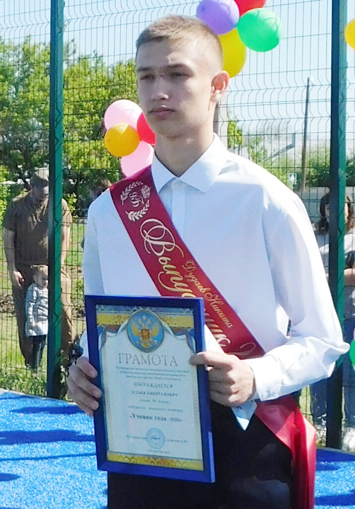 Глава района Василий Шмарин объявляет имя ученика года – 2025. Им стал Никита Дудаев. Это звание школьник заслужил по праву. В этом году у него много достижений: он призёр областного социального проекта «Наука на страже здоровья», патриотического слёта «Равнение на героев», регионального этапа Всероссийского слёта казачьей молодёжи «Готов к труду и обороне», участник Всероссийской профильной смены «Атаманы 21 века» в Анапе.